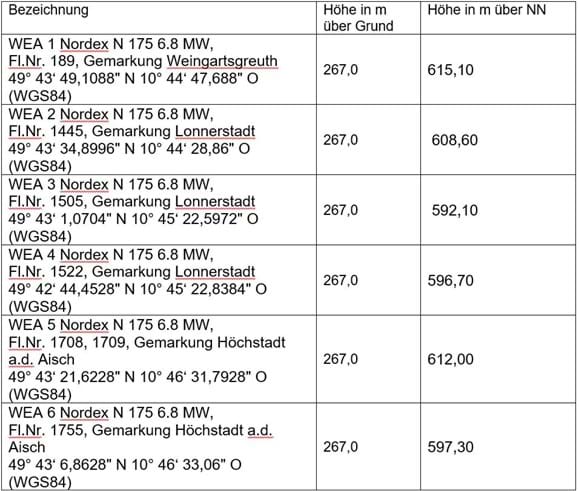 Mit Schreiben vom 16.10.2025 wurde mitgeteilt, dass der Markt Lonnerstadt die Standorte der WEA 2 und WEA 3 aus den sehr großflächigen Grundstücken (Fl.Nrn. 1445 und 1505 jeweils Gemarkung Lonnerstadt) hat herausmessen lassen. Die genehmigten Standorte bleiben unverändert. Die „neuen“ Flurnummern lauten wie folgt: