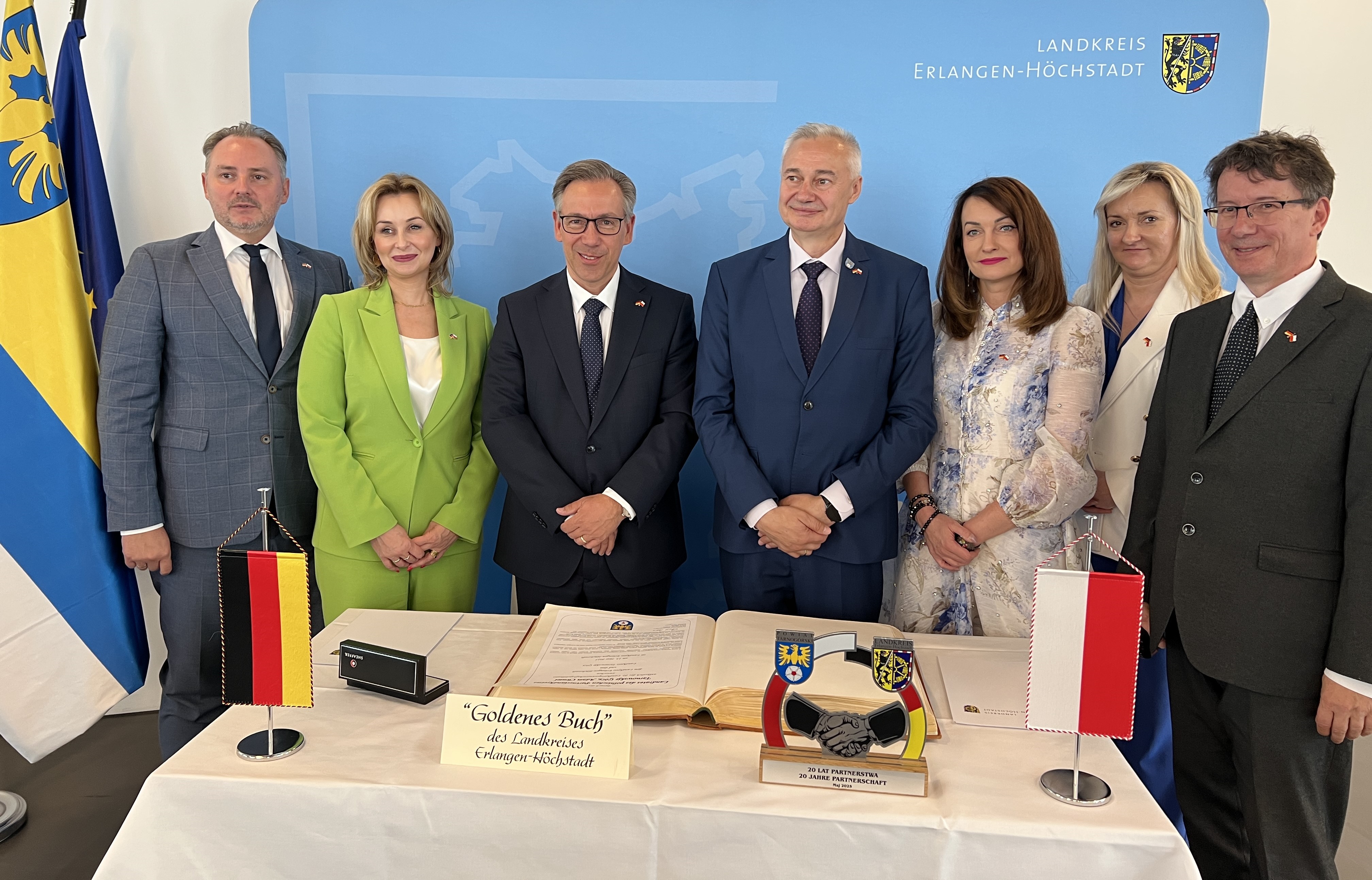 Erlangen-Höchstadt. Die Landkreise Erlangen-Höchstadt und Tarnowskie Góry (Polen) haben dieses Jahr einen besonderen Grund zum Feiern: Seit 20 Jahren pflegen die beiden Landkreise eine aktive Partnerschaft. Anlässlich des Jubiläums reiste eine fünfköpfige polnische Delegation unter Leitung von Landrat Adam Chmiel in den Landkreis Erlangen-Höchstadt. Im Rahmen einer Feierstunde unterzeichneten Landrat Alexander Tritthart und sein polnischer Amtskollege Adam Chmiel eine Partnerschaftsbekräftigung als Symbol für die weiterhin enge Verbundenheit beider Landkreise im Landratsamt. „Diese Partnerschaft ist mehr als eine Verbindung zwischen zwei kommunalen Gebietskörperschaften. Sie verbindet Menschen, hilft Vorurteile abzubauen und Verständnis füreinander zu fördern. Sie ist somit gelebtes Europa und zeigt, wie aus Begegnungen Vertrauen und aus Vertrauen Freundschaft entsteht“, betonte Landrat Alexander Tritthart in seiner Ansprache. Zu den geladenen Gästen zählten zahlreiche Mitgestalter und Weggefährten der Partnerschaft, Kreisrätinnen und Kreisräte, Mitglieder des Freundeskreises sowie Mitarbeitende des Landratsamtes. Musikalisch umrahmt wurde die Feierstunde von Dr. Gerald Fink und Regina Scherer.